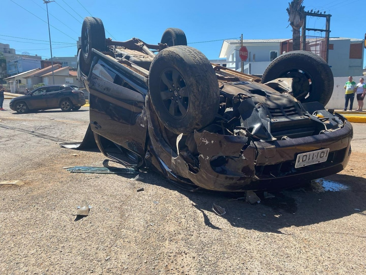 Carro capota na rótula norte de Marau de Marau, entre a avenida Júlio Borella e João Posser. Dois automóveis colidiram e a Hilux capotou próximo ao clube Grêmio Esportivo Liberdade - GEL.