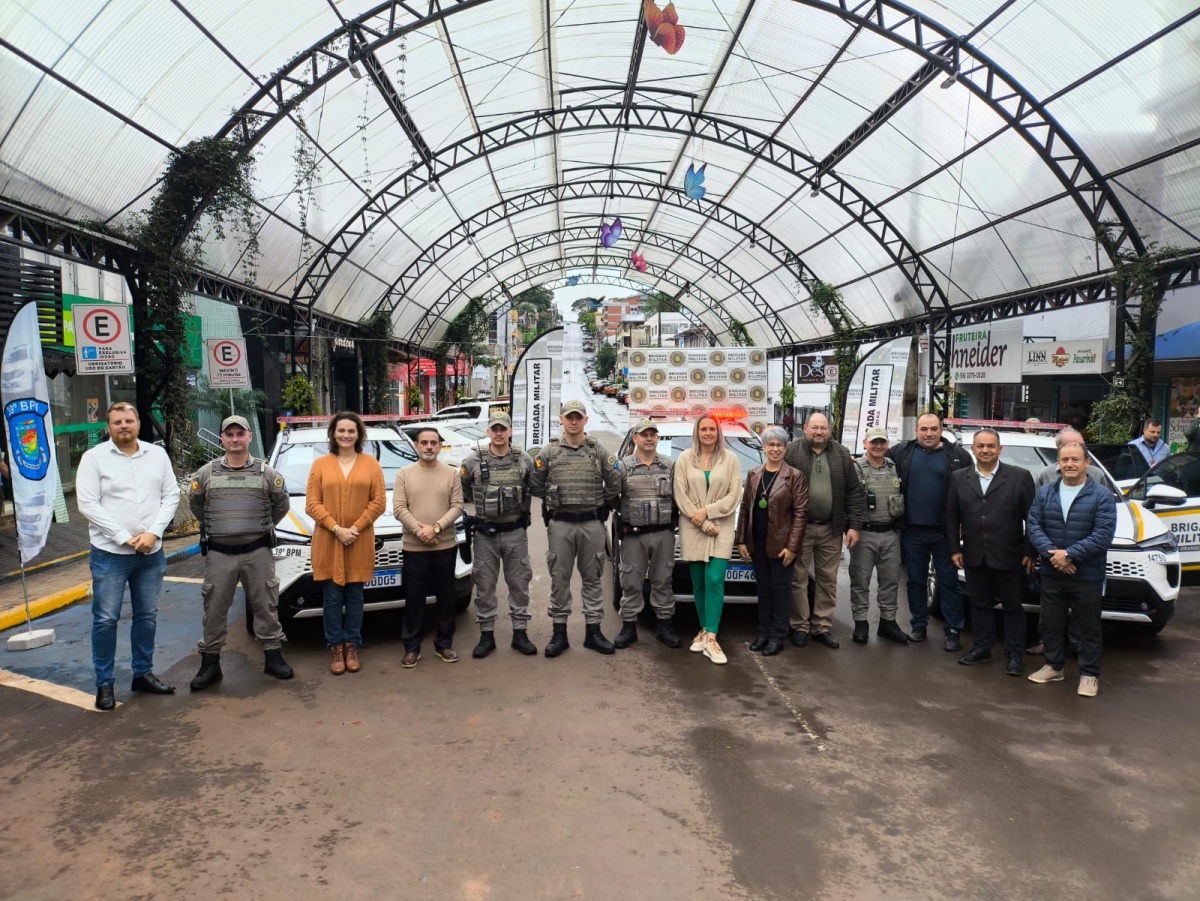 . A solenidade de entrega dos veículos aconteceu na rua coberta no centro da cidade e estiveram presentes várias autoridades locais .