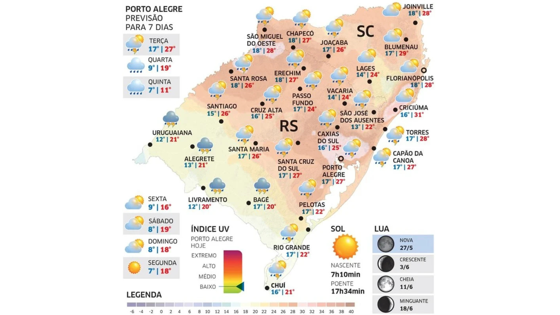 Conforme a MetSul Meteorologia, uma frente fria traz chuva já entre a madrugada e a manhã de terça para pontos do Oeste e depois do Sul. No Centro e Metade Norte, inclusive na Grande Porto Alegre, o sol chega a aparecer por horas, mas o tempo muda com chuva na segunda metade do dia.