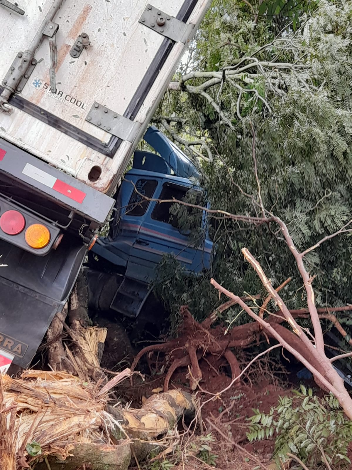 Informações preliminares indicam que o motorista de uma carreta perdeu o controle e saiu da pista vindo a colidir em árvores. Houve apenas danos materiais.